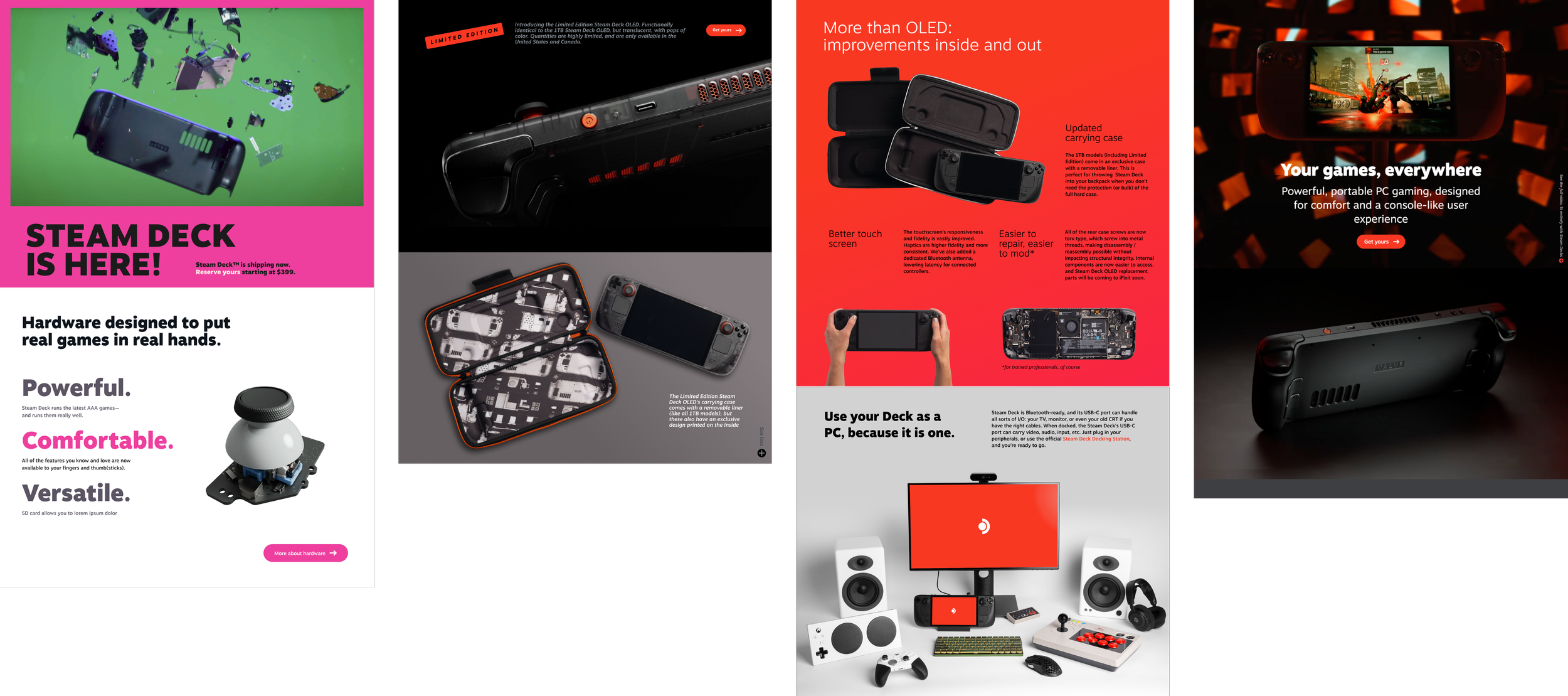 I have been the lead (hands-on) website designer throughout Steam Deck’s life. I have worked through announcements, launches, and updates. My role includes art directing photo and video shoots, and working with the communication team to craft narrative strategy, positioning, and messaging